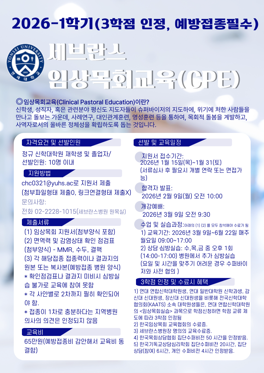 < 2026-1학기 세브란스 임상목회교육(CPE)-3학점 인정, 예방접종필수 >